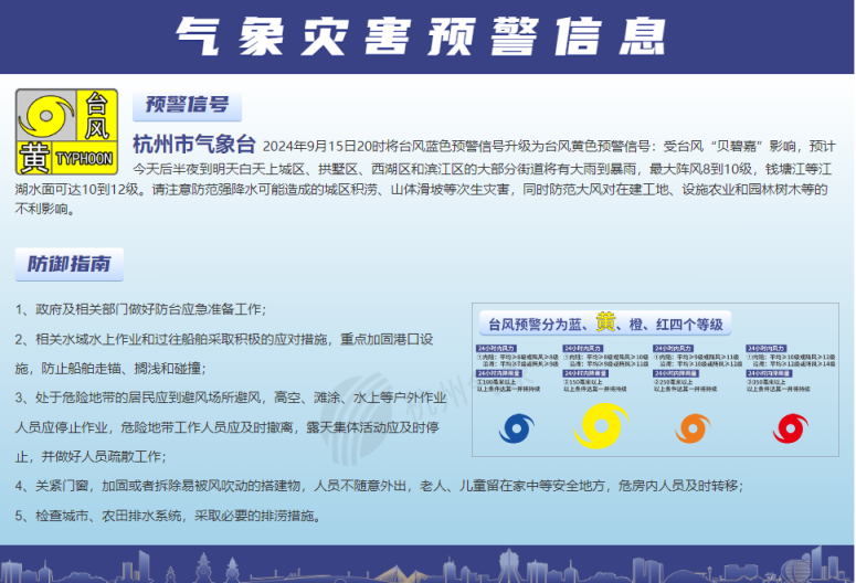 今天20时,杭州市气候台将台风蓝色预警信号升级为台风黄色预警信号: