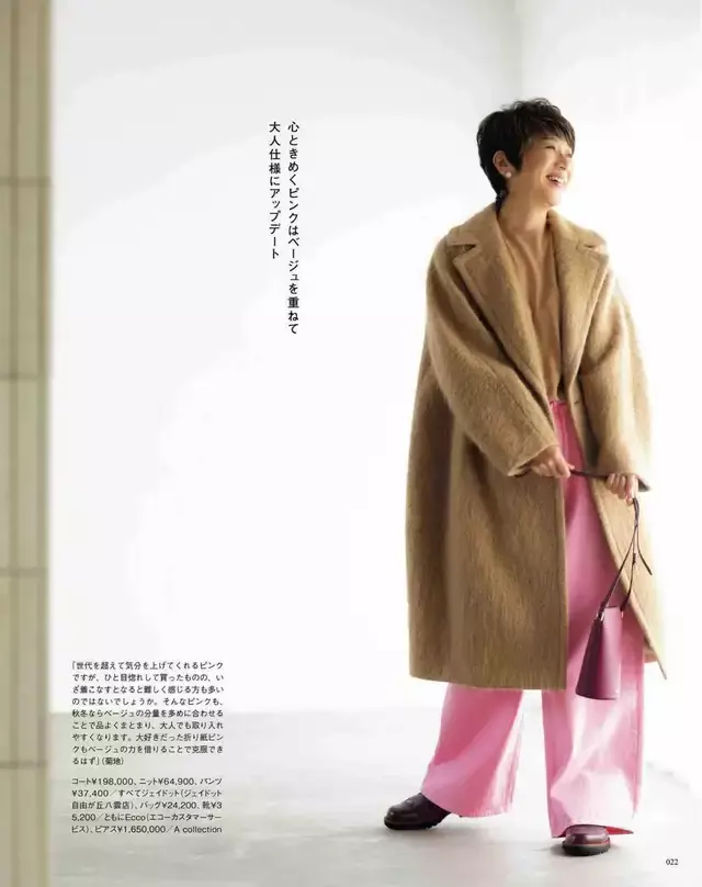 粉色西装裤搭配上地面色系的大衣外衣,是暖色调的诗行,脚穿一对棕色的乐福鞋,走起路来细小惬意。