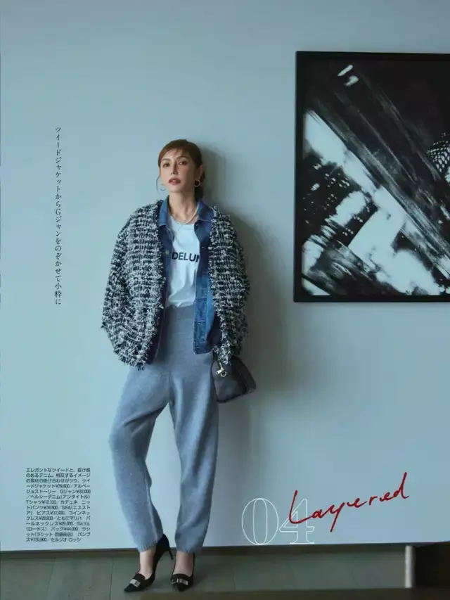像上头这孑然日常穿搭很是耐看,灰色小香风外衣内搭一件蓝色的衬衫,叠穿白色 T 恤,头绪干净又有呼吸感。下半身径直遴荐一条灰色的九分裤,利落又不邋遢。