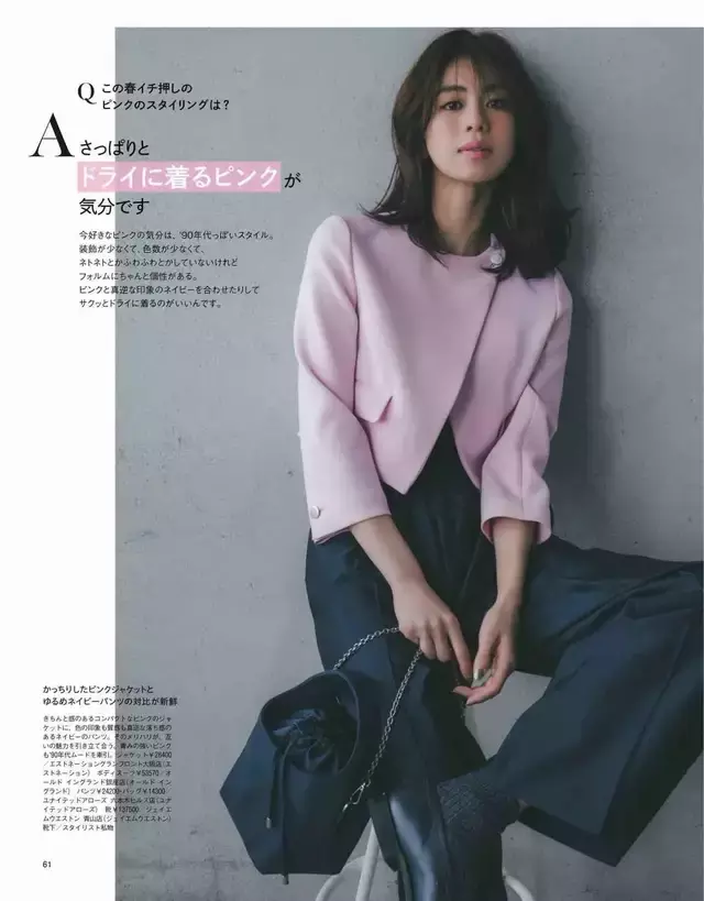 粉色的西装外衣,并非甜腻的仙女粉,更像曙光刚穿过云层时,天边那一抹将醒未醒的良善。淡得很克制,柔得透露,不动声色的贵气,藏在这些搭配细节里。