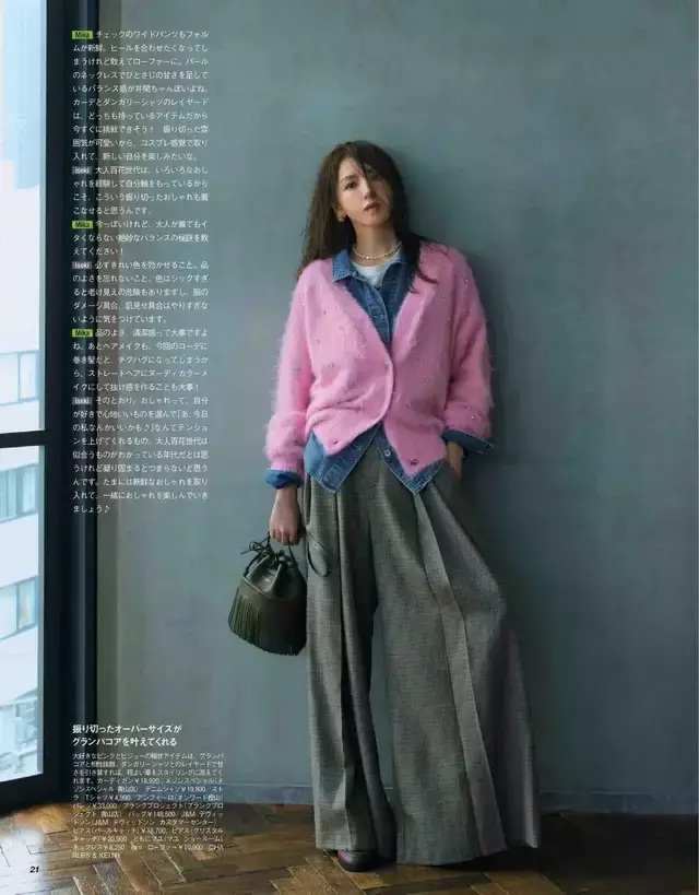 叠穿依旧是春季相比受接待的搭配神态,良善又实用的穿搭念念路值得平素素东说念主模仿。一件粉色竭诚开衫叠穿蓝色牛仔衬衫与白色 T 恤,下装遴荐一条灰色的阔腿长裤,上短下长的搭配手段概况使得穿搭者穿出利落的三七分身段,显高又显瘦。