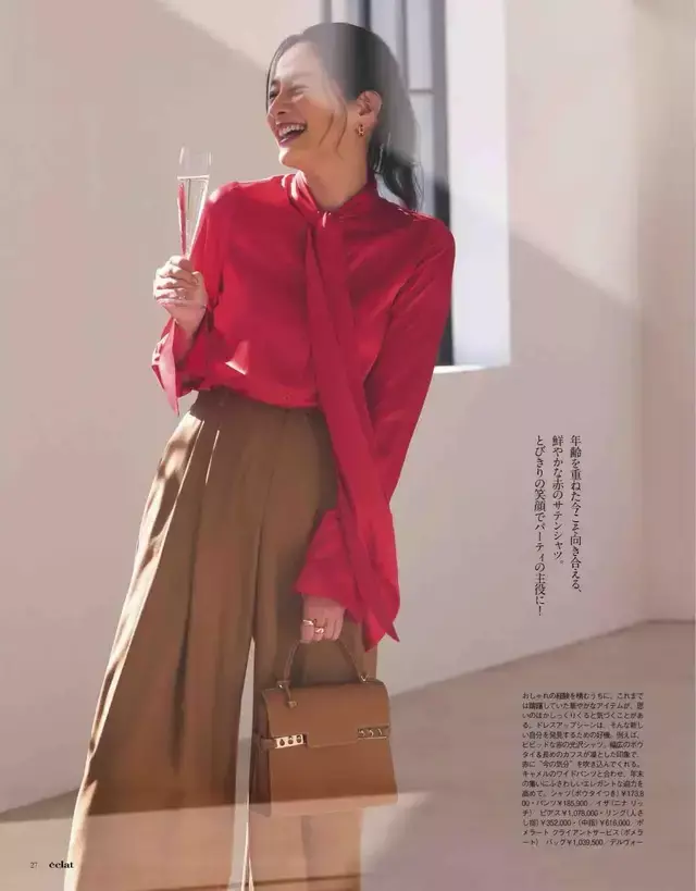 过年时间想让我方的打扮相比喜庆,不错遴荐红色的雪纺衬衫搭配上经典色调的地面色系西装阔腿裤。红色和地面色系组合穿搭,就不会显得过于张扬或焦灼,反而更显密致高档。
