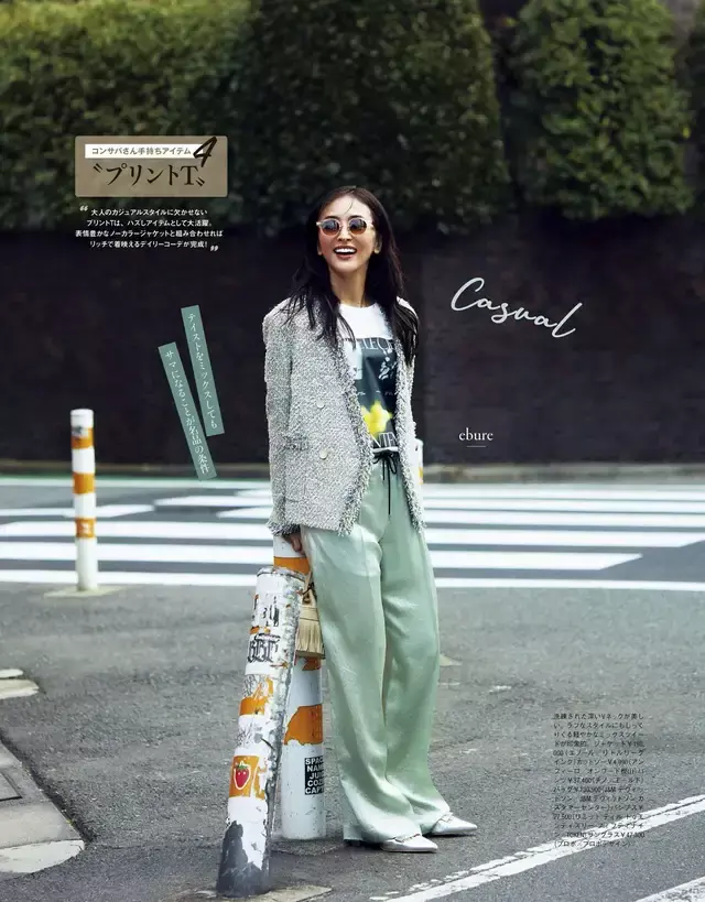 除了良善的粉色衣服单品,日常穿搭也不错尝试别的崭新颜色。浅灰色小香风外衣搭配上一件卡通印花的 T 恤,下装遴荐一条浅绿色的西装裤。色调搭配干净和顺,即兴又减龄。这么的日常风穿搭前锋又耐看。