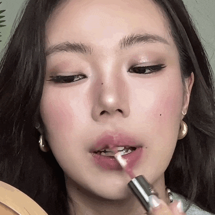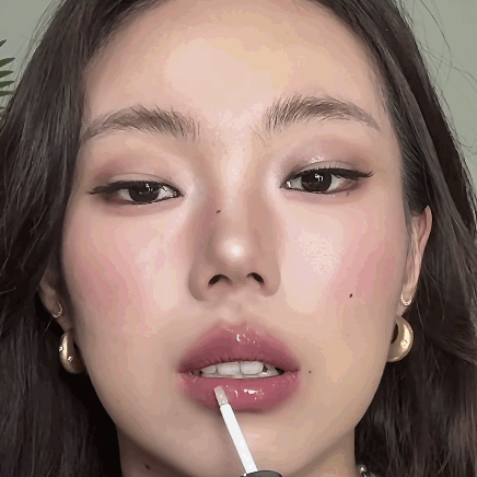 赓续用唇釉头,或专用的唇刷蘸取唇釉,叠涂在唇珠、下唇中间高光处。