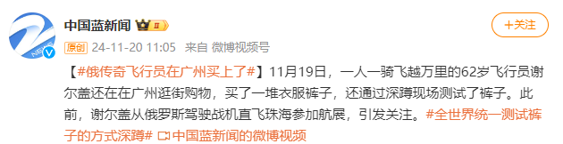 11月19日,一东谈主一骑飞越万里的62岁遨游员谢尔盖·博格丹还在广州逛街购物,买了一堆穿着裤子,还通过深蹲现场测试了裤子。此前,博格丹从俄罗斯驾驶战机直飞珠海投入航展,激勉防范。